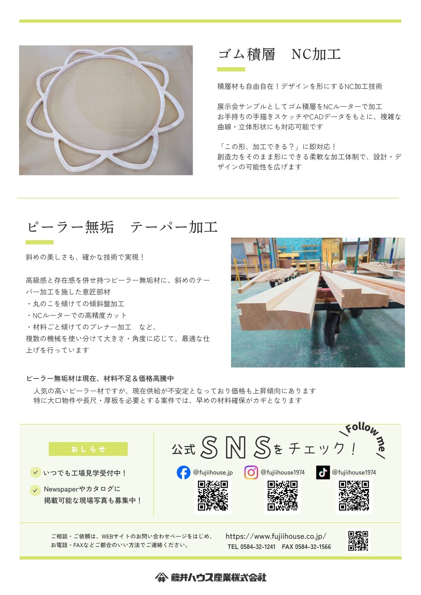 今月号では、多樹種対応の特注加工や、ゴム積層材のNC加工、ピーラー無垢材のテーパー加工など、現場で役立つ最新の加工事例をご紹介しています。
