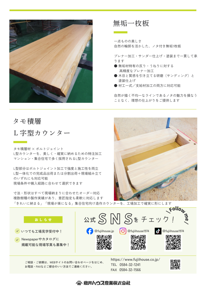 さらに、ノタ付き無垢一枚板の仕上げ工程や、タモ積層材を使用したL字型カウンターの特注加工など、現場で役立つ加工事例も掲載しています。
