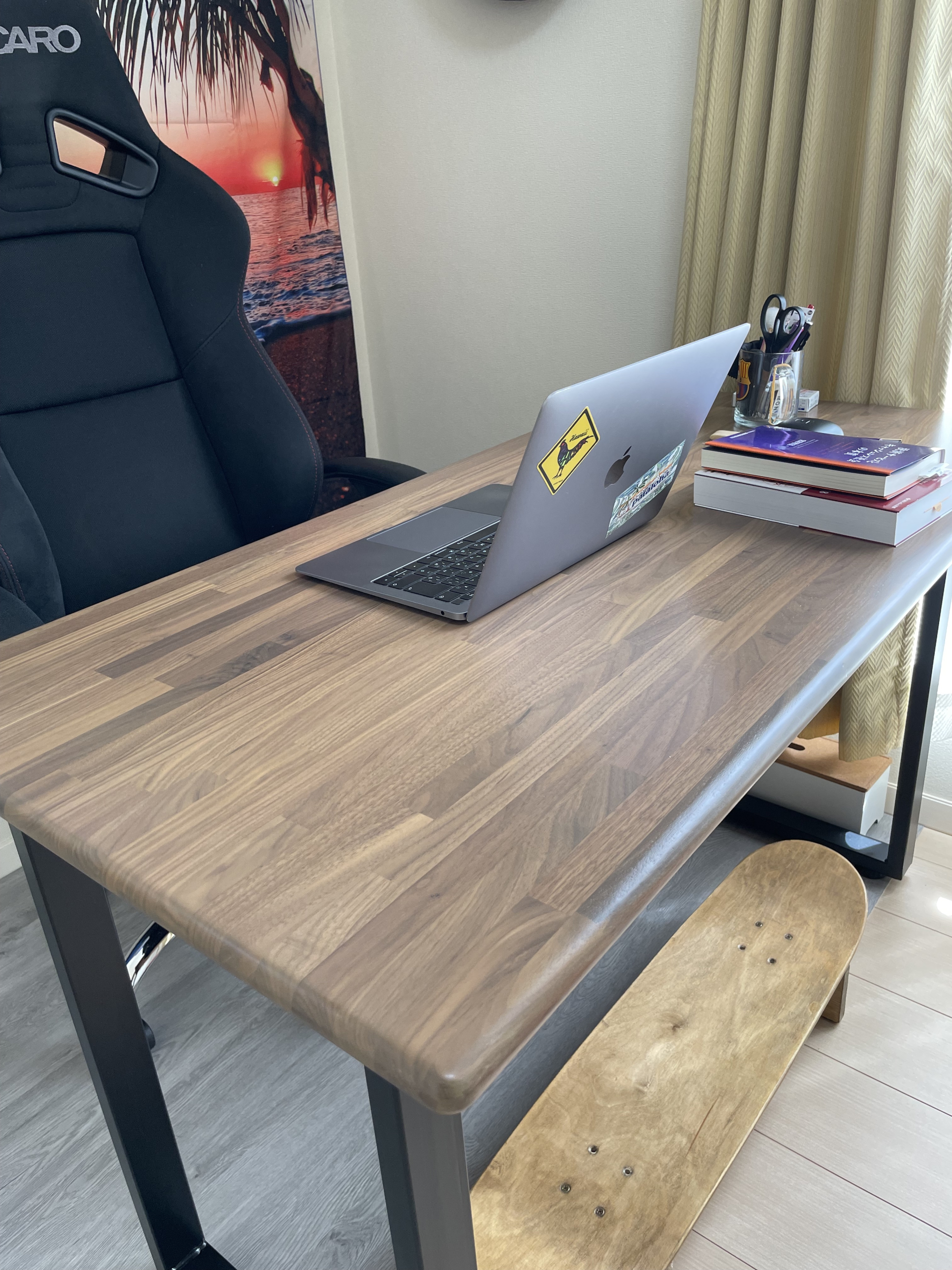 さっそく市販のテーブル脚を取り付け、リモートワーク用のデスクとして大活躍しています。