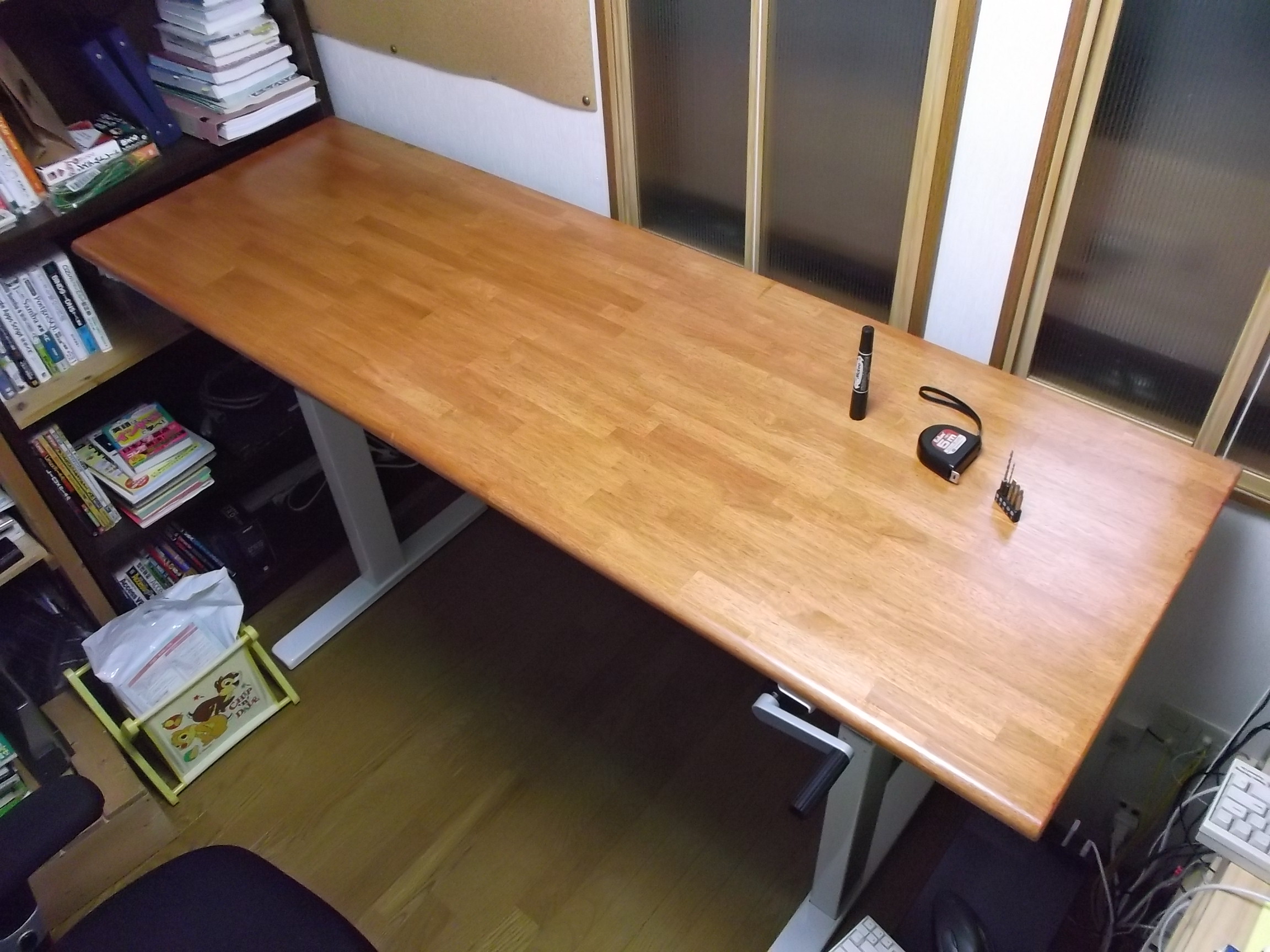 今回は可動机の脚の仕様(重量とサイズ制限内)を満たしながら、部屋の最大有効スペースにあったサイズ、厚み、そして希望予算内で注文できることが何よりのメリットと思います。