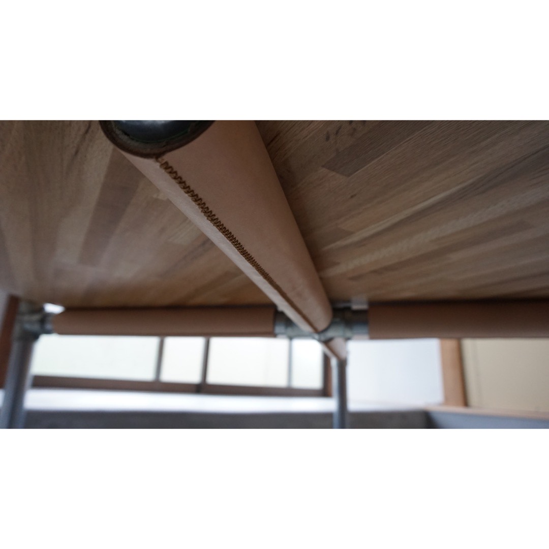 ナラ集成材の美しい木目と、脚部の素材との組み合わせがとても印象的で、